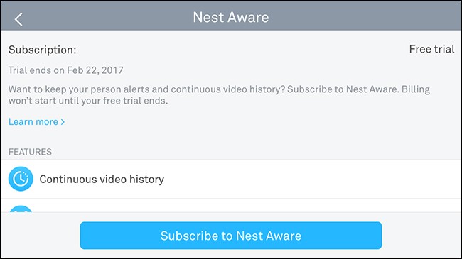 الاشتراك في Nest Aware ، مما يمكّن الكاميرا من حفظ تسجيلات الفيديو عند اكتشاف الحركة وتخزينها لمدة تصل إلى شهر كامل.