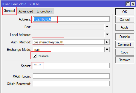 add address=192.168.0.6 auth-method=pre-shared-key-xauth secret="timigate123" passive=yes