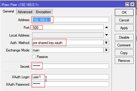 add address=192.168.0.1 auth-method=pre-shared-key-xauth secret="timigate123" xauth-login=user1 xauth-password=password123