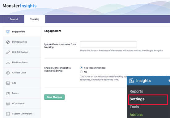 عند التنشيط ، سيضيف plugin عنصر قائمة جديدًا بعنوان “الإحصاءات” إلى قائمة مشرف WordPress. أنت بحاجة إلى زيارة Insights » Settings لتهيئة إعدادات الـ plugin .