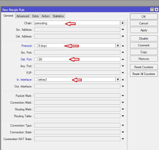 اضبط chain على prerouting، وقم بتعيين protocol على tcp ، وdestination port إلى 80 ، واختر interface التي تتصل بشبكة LAN الخاصة بك كواجهة ، وانقر فوق action، واختر علامة mark connection، واكتب اسمًا لعلامة الاتصال.