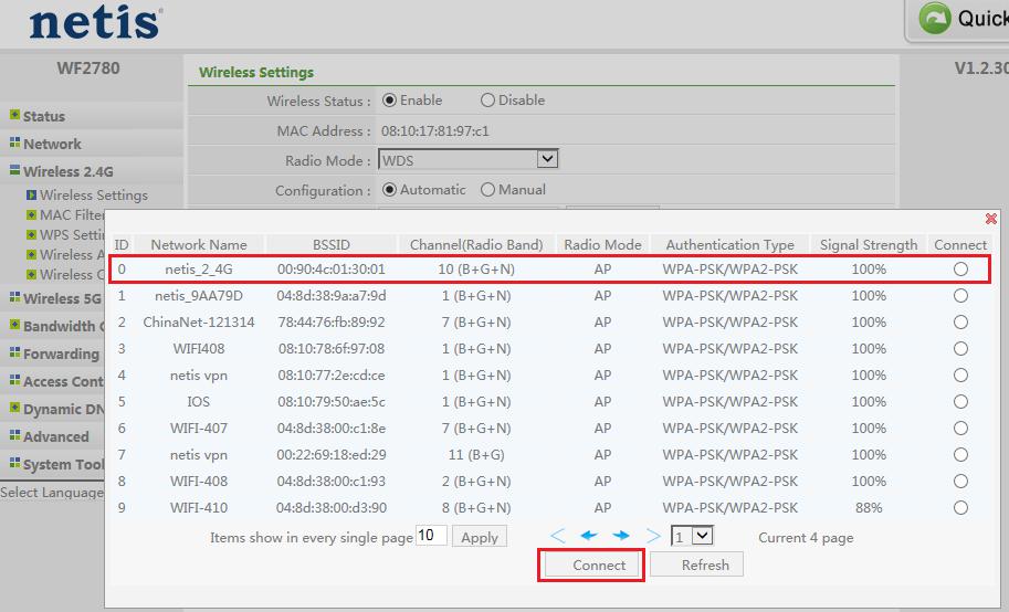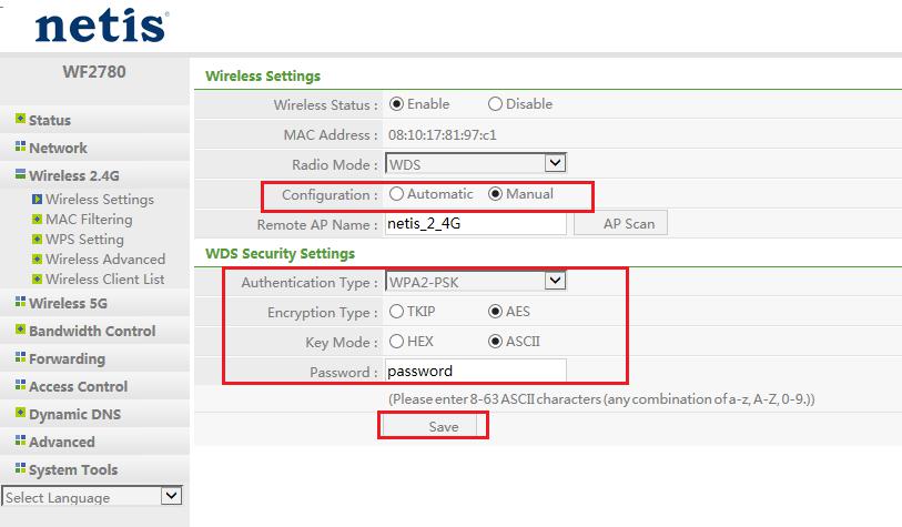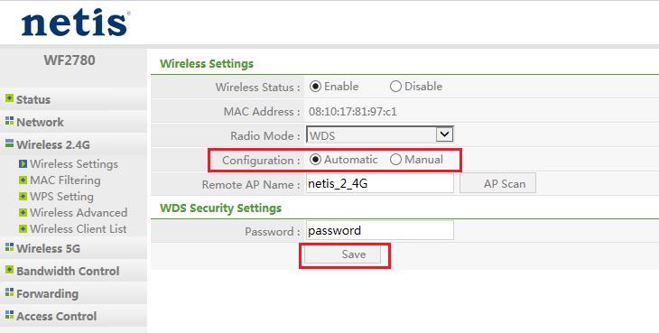 يمكن أن تتطابق أجهزة التوجيه اللاسلكية netis مع تشفير WDS تلقائيًا ، لذا يمكنك اختيار التكوين إلى تلقائي ، وإدخال كلمة المرور وانتظر اتصال الموجه بالشبكة اللاسلكية لجهاز التوجيه الرئيسي.