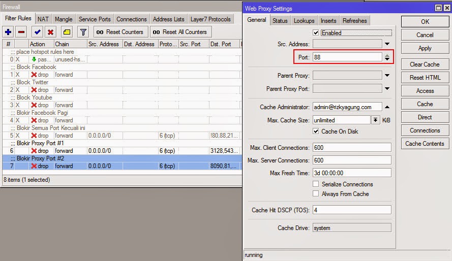 حسنا ، لذلك لا يمكن للعميل استخدام وكيل خارجي لتجاوز جدار الحماية ، ونحن بحاجة لمنع استخدام وكيل الويب الخارجي باستخدام Mikrotik. كيفية إنشاء قاعدة جدار الحماية Mikrotik الذي يمنع استخدام منفذ الوكيل. هذا قد يمنع المستخدم / العميل من استخدام الوكيل.
