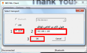 وهذه الطريقه تعتمد على إنشاء قناه اتصال بين هاتفك والكمبيوتر عن طريق استخدام برنامج Wo mic الذي يقوم بإنشاء هذه القناه بالاعتماد على شبكه الواي فاي او البلوتوث او كابل الــ USB