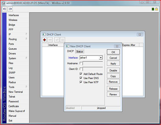 في winbox ، انقر فوق IP> Client DHCP وأضف Client DHCP إلى منفذ ether1