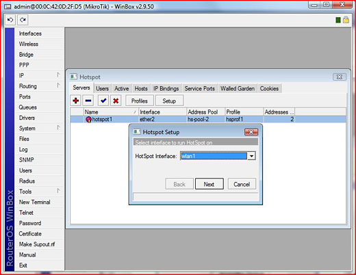 2. لنقم بإضافة خدمة نقطة الاتصال hotspot إلى wlan انقر فوق IP> HotSpot في مربع إعداد نقطة الاتصال ، اختر wlan1 كواجهة نقطة فعالة.