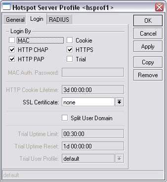 في ملفات تعريف نقطة الاتصال (IP> HotSpot> Profiles) ، اختر ملف تعريف نقطة الاتصال وانقر فوق علامة تبويب radius ، ثم تحقق من radius . ثم انقر فوق علامة التبويب تسجيل الدخول وإلغاء تحديد ملف تعريف الارتباط ، والسماح بـ https ، http pap و chap.