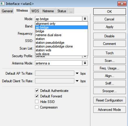 انقر على interface، انقر نقرا مزدوجا فوق wlan1 ، انقر فوق Mode: وحدد ap bridge وتأكد من ضبط التردد على 2.4 b / G.