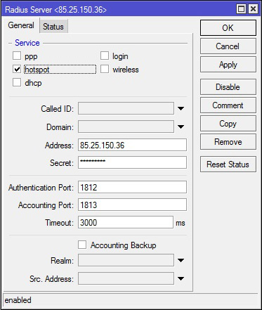 انقر فوق Services > Hotspot ، أدخل radius العنوان: radius2.hotspotsystem.com ، كلمة السر: hotsys123