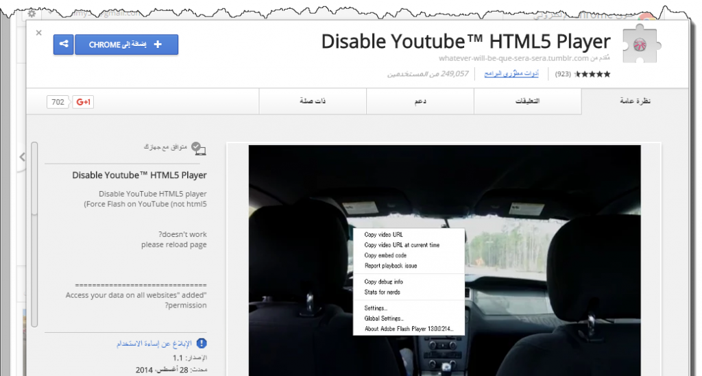 سوف نستخدم اضافه Disable Youtube™ HTML5 Player لايقاف استخدام لغه HTML5 فى مشغل اليوتيوب حيث يمكنكم تحميلها من متجر جوجل كروم عن طريق الرابط التالى