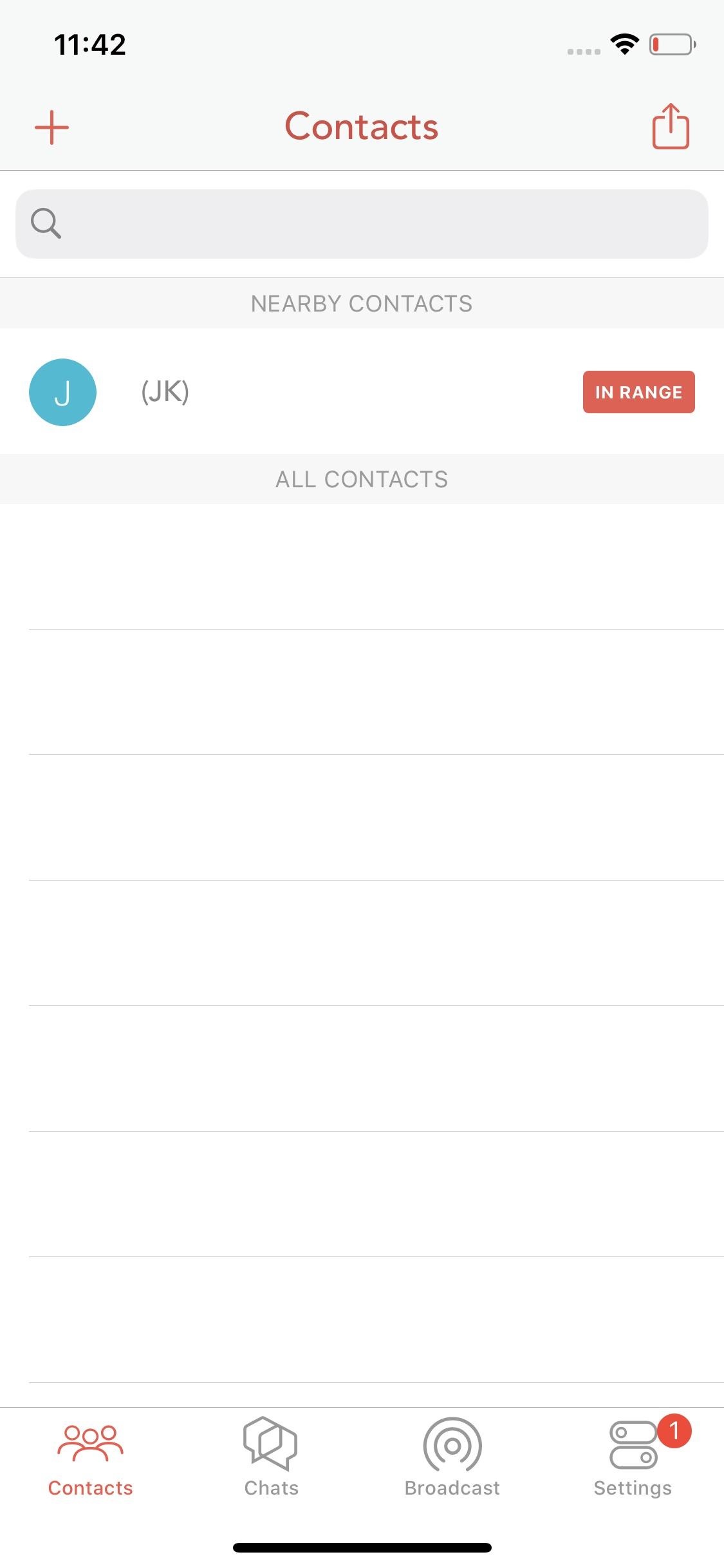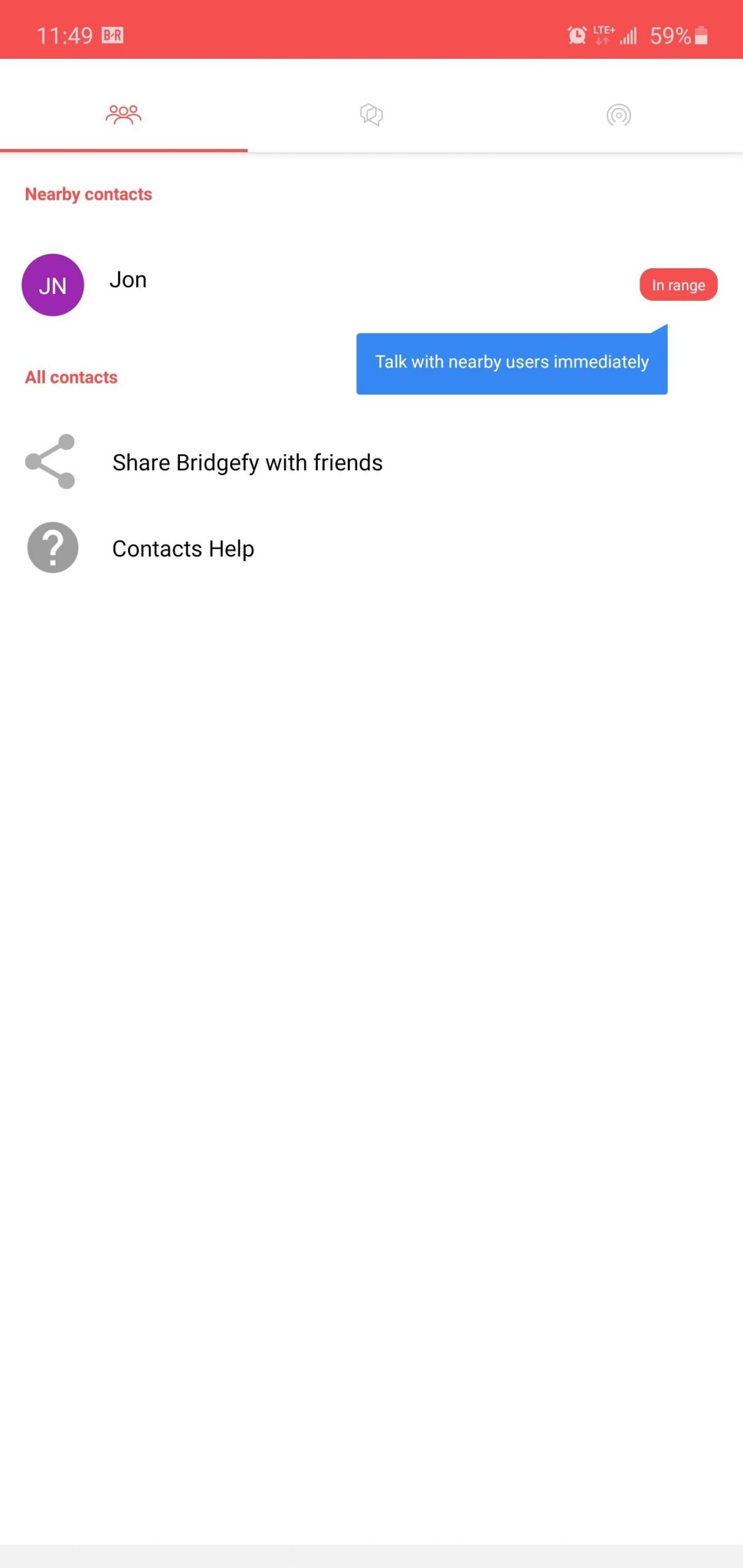 إذا كُنت ترغب في الدردشة مباشرة مع شخص واحد ، فقم بالذهاب إلى علامة التبويب جهات الاتصال والتواصل معه ، ولكن إذا كُنت ترغب في التحدث إليهم في وضع عدم الاتصال ، فيجب أن يكونوا قريبين منك ، وهو ما يشير إليه التطبيق من خلال وضعهم تحت “جهات الاتصال القريبة منك”.