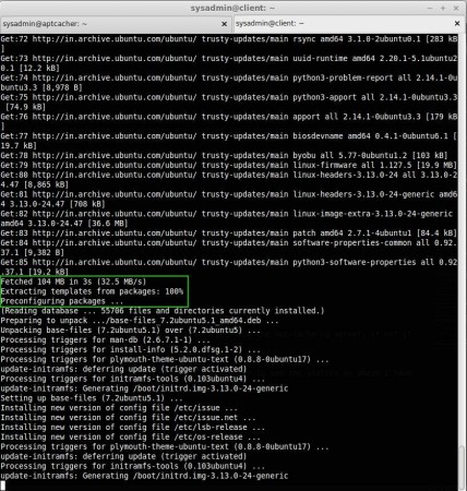 ولكن انظر الصورة أدناه كيف جلبت 104 ميغابايت في 3 ثوان؟ هذا لأنه تم تخزينه مؤقتًا بالفعل في خادم apt-cacher-ng.