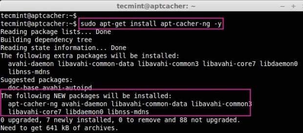 بينما نقوم بتحميل أي حزم للتثبيت في أي من أجهزة Debian / Ubuntu ، إذا كانت الحزمة متوفرة في apt-cache فسوف تحصل عليها من خادم apt-cache-ng ، إذا لم يتم جلبها من الإنترنت إلى مستودع محلي للاستخدام المستقبلي.