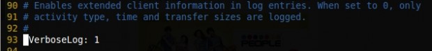 للحصول على مزيد من المعلومات حول “log” ، يتعين علينا إلغاء ربط السطر التالي ، إذا قمنا بتعيينه على 0 ، فسيتم تسجيل نوع النشاط فقط ، والوقت ، وحجم نقل الحزم لدينا.