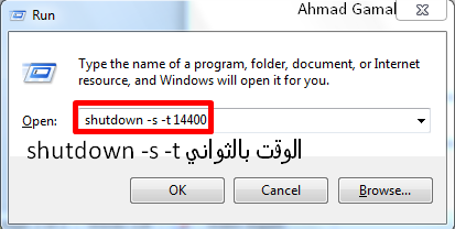 وسيتم كتابه الأمر كالتالي :- shutdown –s –t 14400