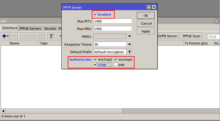 5. انقر – زر PPTP Server وحدد المربع “Enabled” و “chap” كأسلوب مصادقةPPTP Server