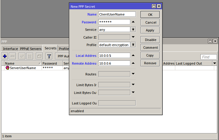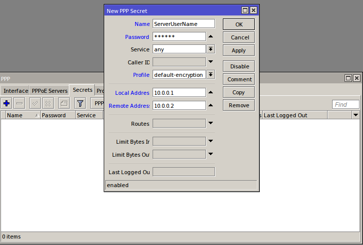 على Remote address أدخل: 10.0.0.2 (سيكون هذا هو العنوان الذي سيستخدمه الخادم لكافة الاتصالات)