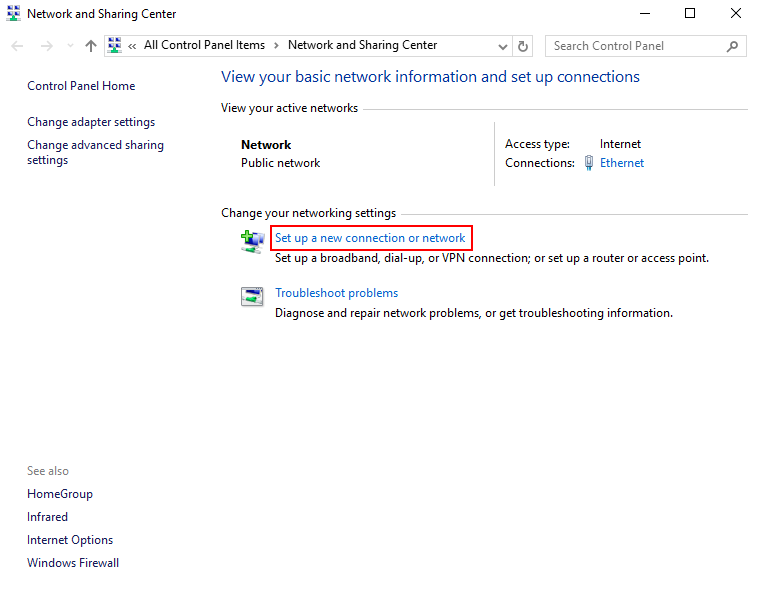 2. انقر على “إعداد اتصال أو شبكة جديدة”