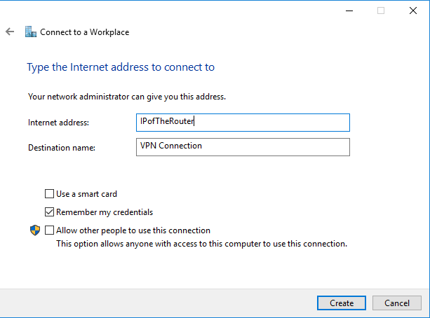 5. على Internet address : اكتب عنوان IP الحقيقي لجهاز توجيه VPN ، على اسم الوجهة ، اسم مستعار من اختيارك ، ثم انقر فوق إنشاء