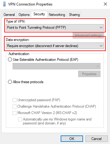 7. انتقل إلى علامة التبويب “Security” ، قم بتغيير “نوع VPN” إلى PPTP ، و “Data encryption” إلى “Require encryption”
