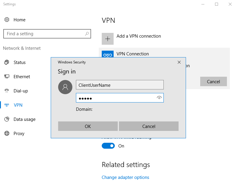 11. في النافذة المنبثقة ، أدخل بيانات الاعتماد التي قمت بتعيينها في جهاز توجيه VPN وانقر فوق موافق.