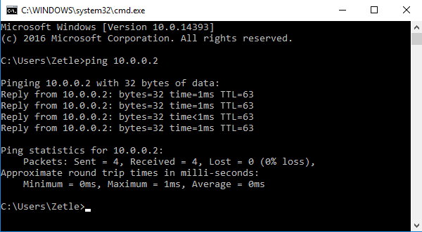 13. تحقق من الاتصال بين عميل Windows و Server عبر tunnel: انقر فوق قائمة “ابدأ” واكتب “cmd” واضغط على Enter. في موجه الأوامر ، حاول تنفيذ الأمر ping على عنوان IP الخاص بـ VPN الخاص بالخادم: ping 10.0.0.2