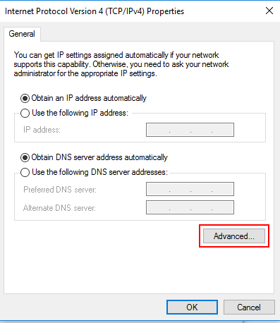 8. انتقل إلى علامة تبويب “Networking” ، وحدد “Internet Protocol Version 4” ثم انقر فوق Properties ، ثم Advanced