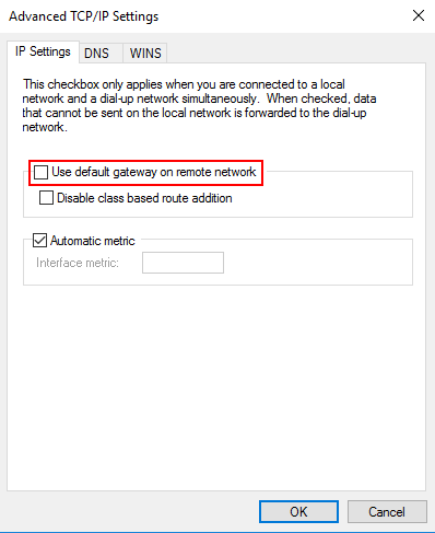 9. قم بإلغاء تحديد “Use default gateway on remote network” وانقر فوق موافق