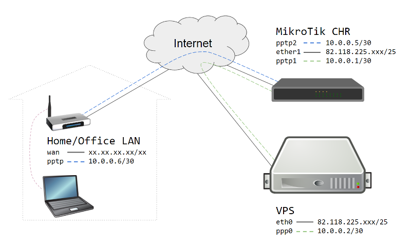 الوصف: سيعمل CHR كجدار ناري ومركَّب VPN. لديه اتصال محلي بـ Debian VPS ، وهو آمن تمامًا نظرًا لبيئة cloud . يتصل السيرفر بخادم VPN عبر PPTP وسيتم استخدام tunnel الجديد لتوجيه جميع الزيارات من وإلى الخادم.