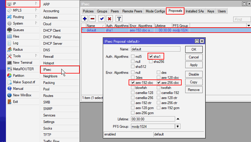 - في Winbox ، انقر فوق IP> IPsec> Proposals