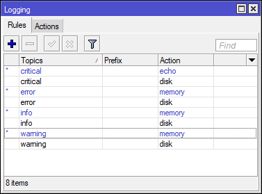 تكوين التسجيل الافتراضي على جهاز التوجيه MikroTik هو فقط للاحتفاظ بالسجلات في الذاكرة.