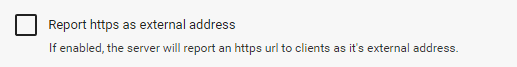 تستخدم تطبيقات Emby بروتوكول http افتراضيًا. من أجل إجبارهم على استخدام https ، يمكنك تكوين الخادم للإبلاغ عن عنوان URL الخارجي الافتراضي الخاص به باعتباره عنوان URL لـ http.