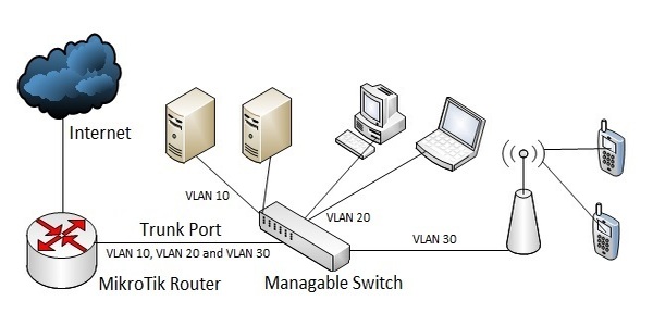 إذا كنت ترغب في إنشاء شبكة  (VLAN) لشبكتك المحلية ، فيجب عليك اعداد switch يمكن التحكم فيه. سنتحدث عنه فيما بعد . وسوف تظهر كيفية تكوين التوجيه بين الشبكات المحلية الظاهرية (VLAN) باستخدام برنامج MikroTik Router والـ switch القابل للإدارة.