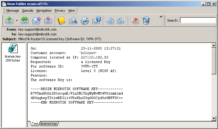 ابحث عن البريد الإلكتروني من mikrotik الذي يحتوي على مفتاحك
