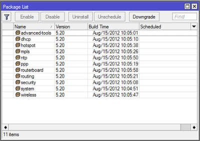 بداية نتأكد من وجود الحزمة الخاصة بهذا التطبيق ضمن حزم وملفات المايكروتك بالذهاب الى (system) ثم (packages) لتظهر النافذة المشابهة للتالي: