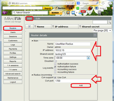 والان نبدأ اعدادات المايكروتك في مدير المستخدمين بالذهاب الى تبويب (Router) ثم (Add) ثم (new) ثم نقوم بأدخال المعلومات كما في النافذة ادناه: