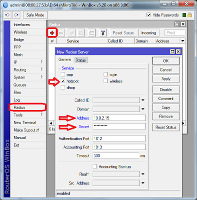 بداية يفترض اننا قمنا بتفعيل وتشغيل المايكروتك كهوت سبوت (كما تم شرح ذلك في مقالات سابقة ضمن سلسلة المايكروتك) والان نقوم بفتح ال(winbox) والذهاب الى (Radius) ثم النقر على اشارة (+) لتظهر نافذة نختار منها نوع السيرفر (hotspot) ونقوم بأدخال عنوان (IP address) الخاص بمنفذ ال(WAN) لراوتر المايكروتك او ببساطة نقوم بجعله (127.0.0.1) ونفعل منافذ التحكم ونقوم بأدخال كلمة سر خاصة بمدير النظام (secret) ولتكن (testing123) كمثال ثم (ok) وكما في النافذة التالية: