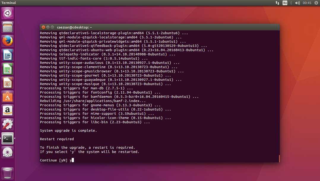 8. أخيرًا ، بعد انتهاء عملية الترقية بنجاح ، سيعلمك المثبت أنه يجب إعادة تشغيل النظام من أجل تطبيق التغييرات وإنهاء عملية الترقية بالكامل. أجب بنعم للمتابعة.