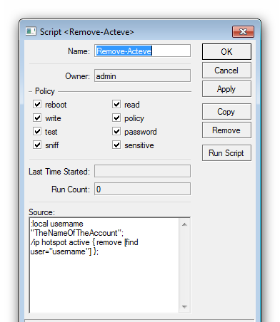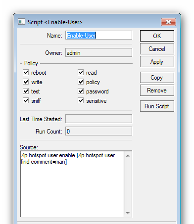 /system script add name=Enable-User policy=ftp,reboot,read,write,policy,test,winbox,password,sniff,sensitive source=”/ip hotspot user enable [/ip hotspot user find comment=man]” add name=Disable-User policy=ftp,reboot,read,write,policy,test,winbox,password,sniff,sensitive source=”/ip hotspot user disable [/ip hotspot user find comment=man]” add name=Remove-Acteve policy=ftp,reboot,read,write,policy,test,winbox,password,sniff,sensitive source=\ “:local username \”TheNameOfTheAccount\”;\r\ \n/ip hotspot active { remove [find user=\”username\”] };”
