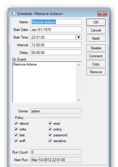 /system scheduler add comment=”” disabled=no interval=12h name=Disable-User on-event=Disable-User policy=reboot,read,write,policy,test,password,sniff,sensitive start-date=jan/01/1970 start-time=\ 22:00:00 add comment=”” disabled=no interval=12h name=Enable-User on-event=Enable-User policy=reboot,read,write,policy,test,password,sniff,sensitive start-date=jan/01/1970 start-time=\ 09:00:00 add comment=”” disabled=no interval=12h name=Remove-Acteve on-event=Remove-Acteve policy=reboot,read,write,policy,test,password,sniff,sensitive start-date=jan/01/1970 start-time=\ 22:01:00