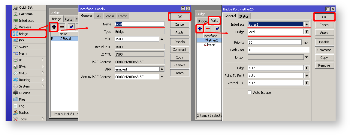 /interface bridge add name=local/interface bridge port add interface=ether2 bridge=local/ip address add address=192.168.88.1/24 interface=local |