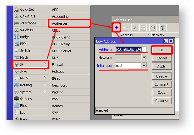 أدخل عنوان IP 192.168.88.1/24 حدد الواجهة المحلية من القائمة المنسدلة وانقر على زر موافق ؛
