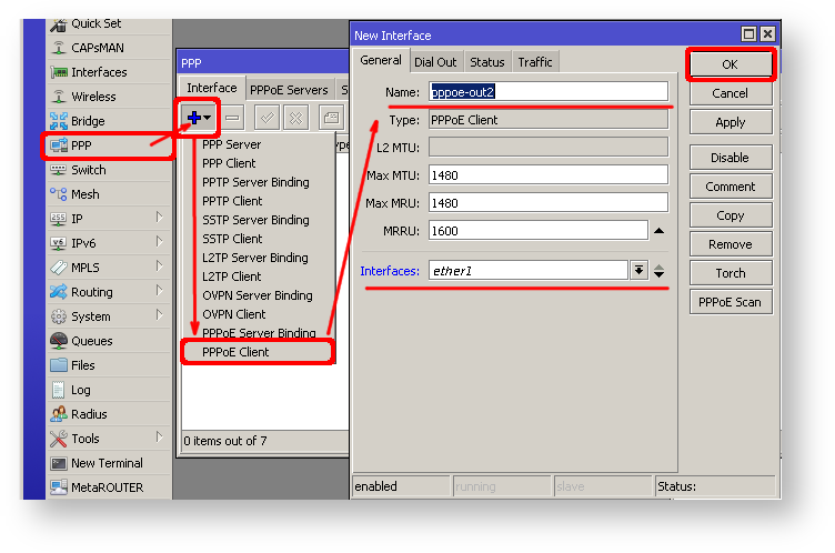 افتح نافذة PPP ، يجب تحديد علامة التبويب Interfaces ؛