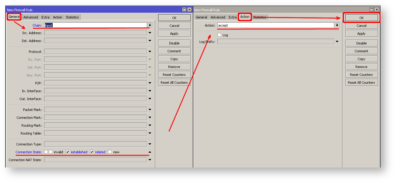 /ip firewall filter add chain=forward action=fasttrack-connection connection-state=established,related \ comment="fast-track for established,related"; add chain=forward action=accept connection-state=established,related \ comment="accept established,related"; add chain=forward action=drop connection-state=invalid add chain=forward action=drop connection-state=new connection-nat-state=!dstnat \ in-interface=ether1 comment="drop access to clients behind NAT form WAN" |