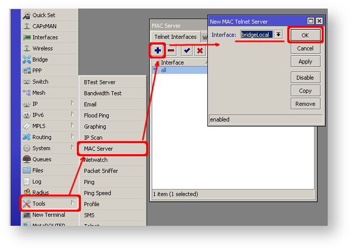 [admin@MikroTik] /tool mac-server> printFlags: X - disabled, * - default # INTERFACE 0 * all |