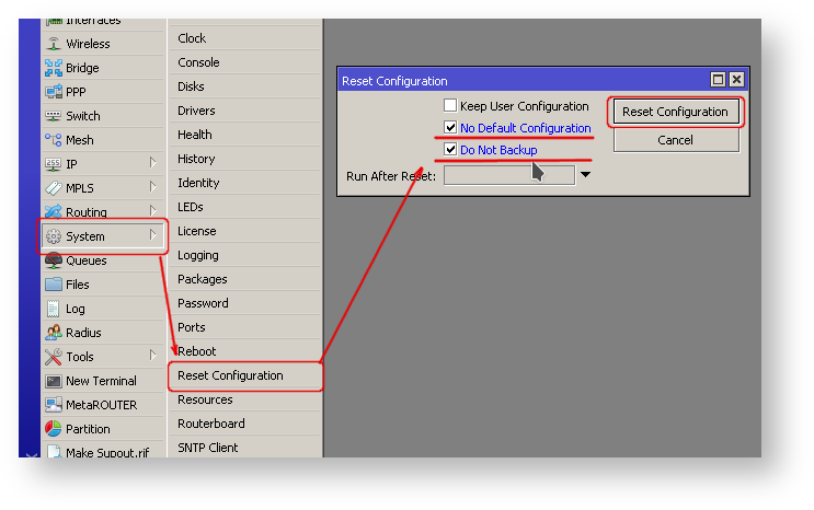 نظرًا لأن هذه المقالة ستفترض عدم وجود تكوين على جهاز التوجيه ، فيجب إزالته بالضغط على “r” على لوحة المفاتيح عند المطالبة أو النقر فوق الزر “إزالة التكوين” في WinBox.