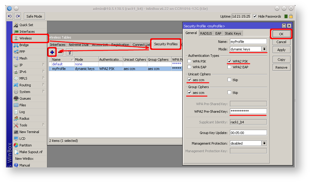 /interface wireless security-profiles add name=myProfile authentication-types=wpa2-psk mode=dynamic-keys \ wpa2-pre-shared-key=1234567890 |