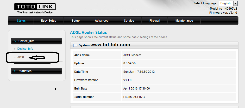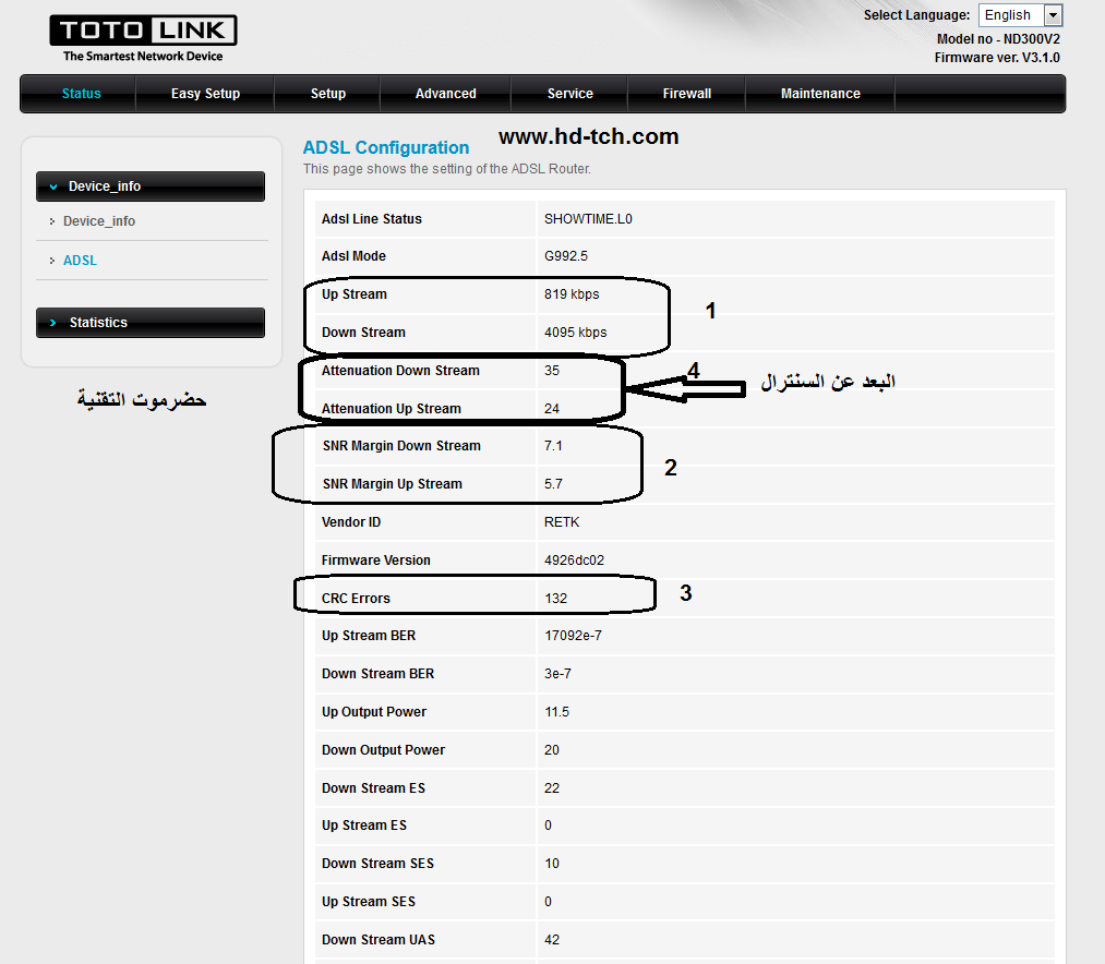 يوجد في المودم قوائم خاصة تعطي معلومات هامه عن طبيعه الخط وجودته ( سيكون مثالنا هنا على مودم توتولينك TOTO LINK ) فبعد الدخول على المودم