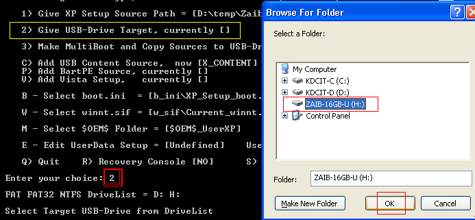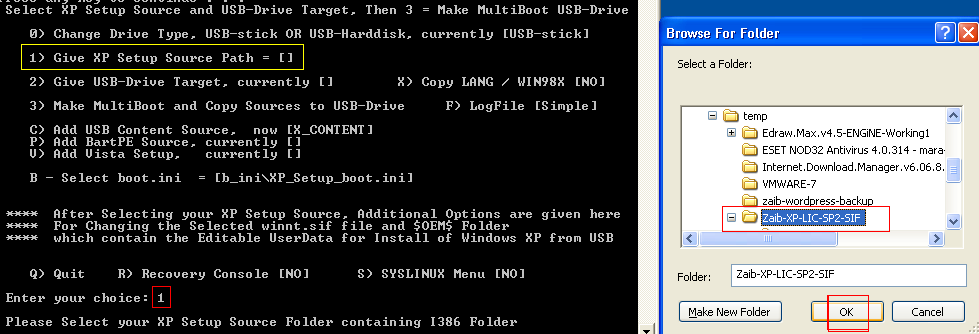 حدد الخيار 1> حدد مسار مصدر WINDOWS XP (قرص مضغوط أو إصدار مستخرج)