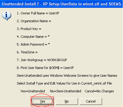 سوف يطلب منك ما إذا كنت تريد تثبيت XP في وضع Un-Attendend mode ، مما يعني أنه سيتم إدخال المعلومات المطلوبة تلقائيًا أثناء تثبيت الإعداد مثل أسماء المستخدمين / Windows XP CD KEY / TimeZone الخ.